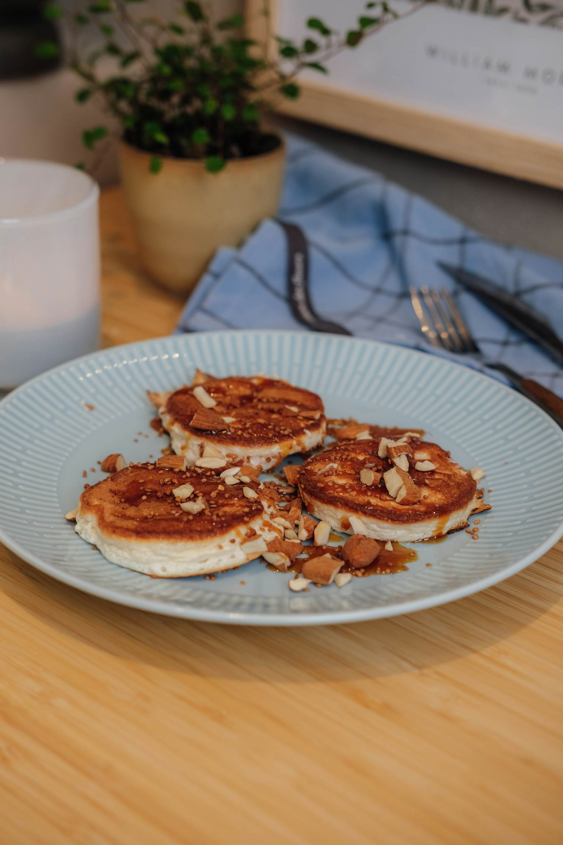 Fluffy japanske pandekager er en dessert, der skiller sig ud. Disse pandekager er kendt for deres højde og lette tekstur, som nærmest minder om en soufflé. I denne opskrift toppes de høje pandekager med kaffecrisp, mandler og saltkaramelsauce - en sød og smagfuld dessert, der passer til enhver anledning.