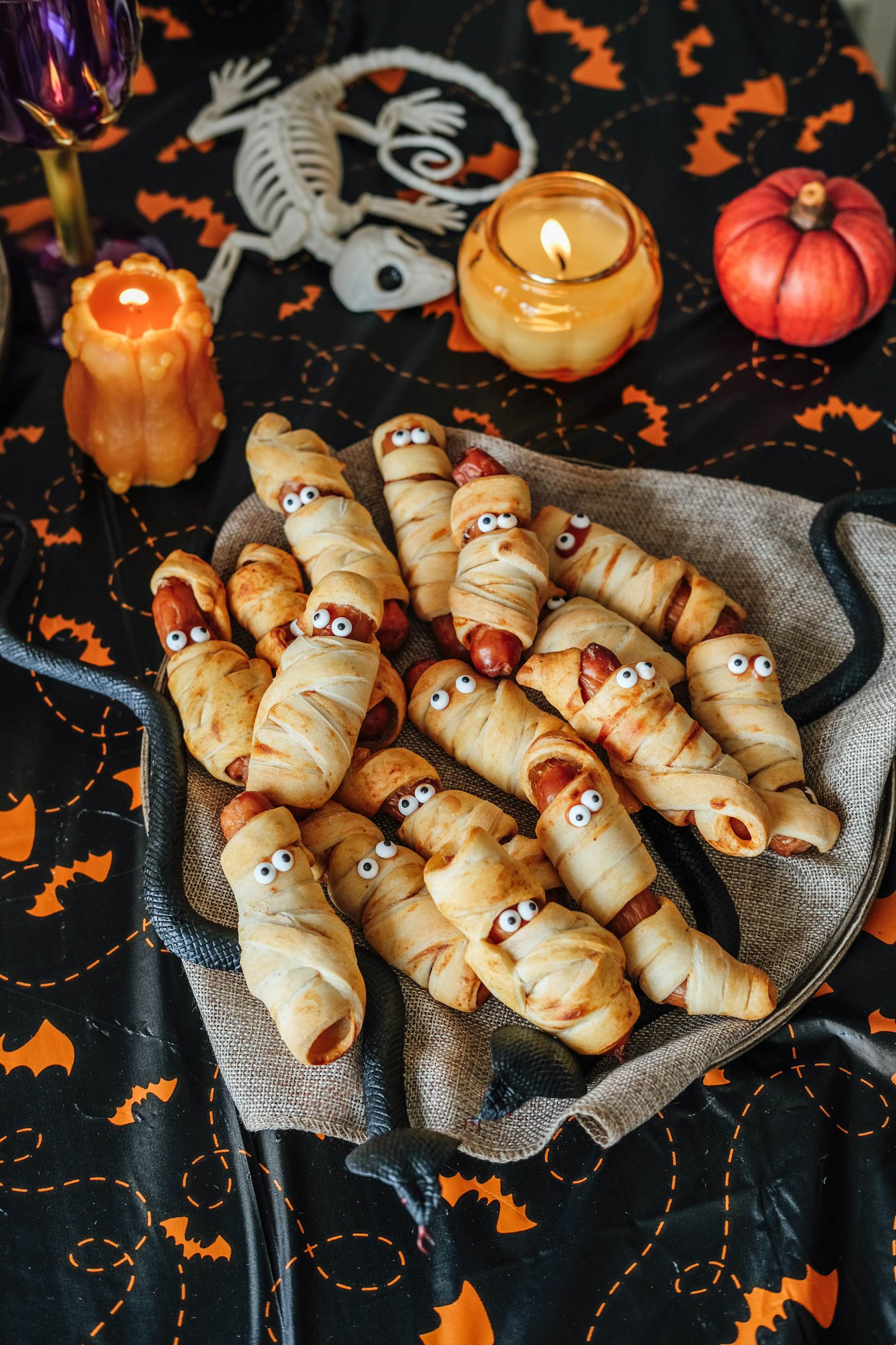 8. Server de søde mumiepølsehorn på halloween-bordet